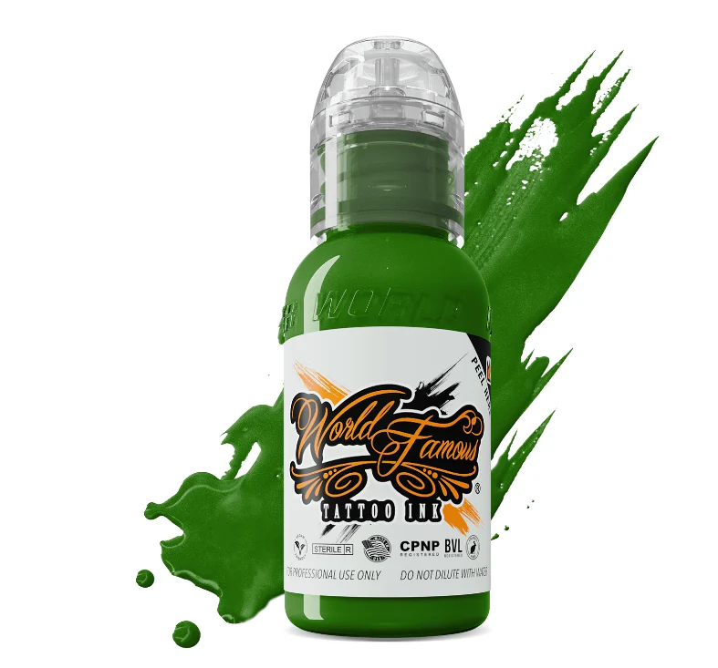 Gracias a la alta carga pigmentaria y la fórmula profesional de World Famous Tattoo Ink, Everglades Green ofrece una aplicación fluida, saturación uniforme y una curación estable, manteniendo su riqueza cromática y profundidad visual con el paso del tiempo. Un verde imprescindible para artistas que buscan naturalidad, control y potencia visual en cada composición.