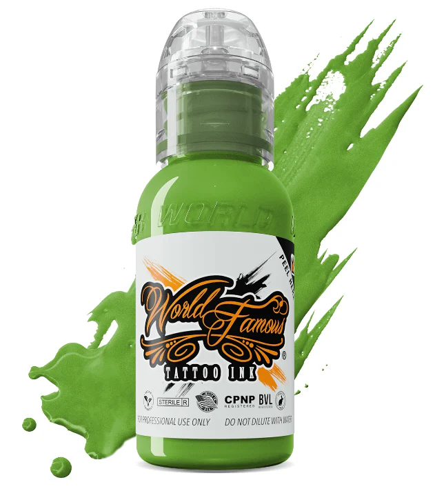 Este tono funciona especialmente bien en hojas, vegetación, fondos botánicos y elementos orgánicos, aportando vida y contraste sin perder naturalidad. Gracias a la reconocida calidad de World Famous Ink, Green Day ofrece una aplicación fluida, saturación consistente y una curación estable, garantizando un color duradero y fiel al tono original en la piel.